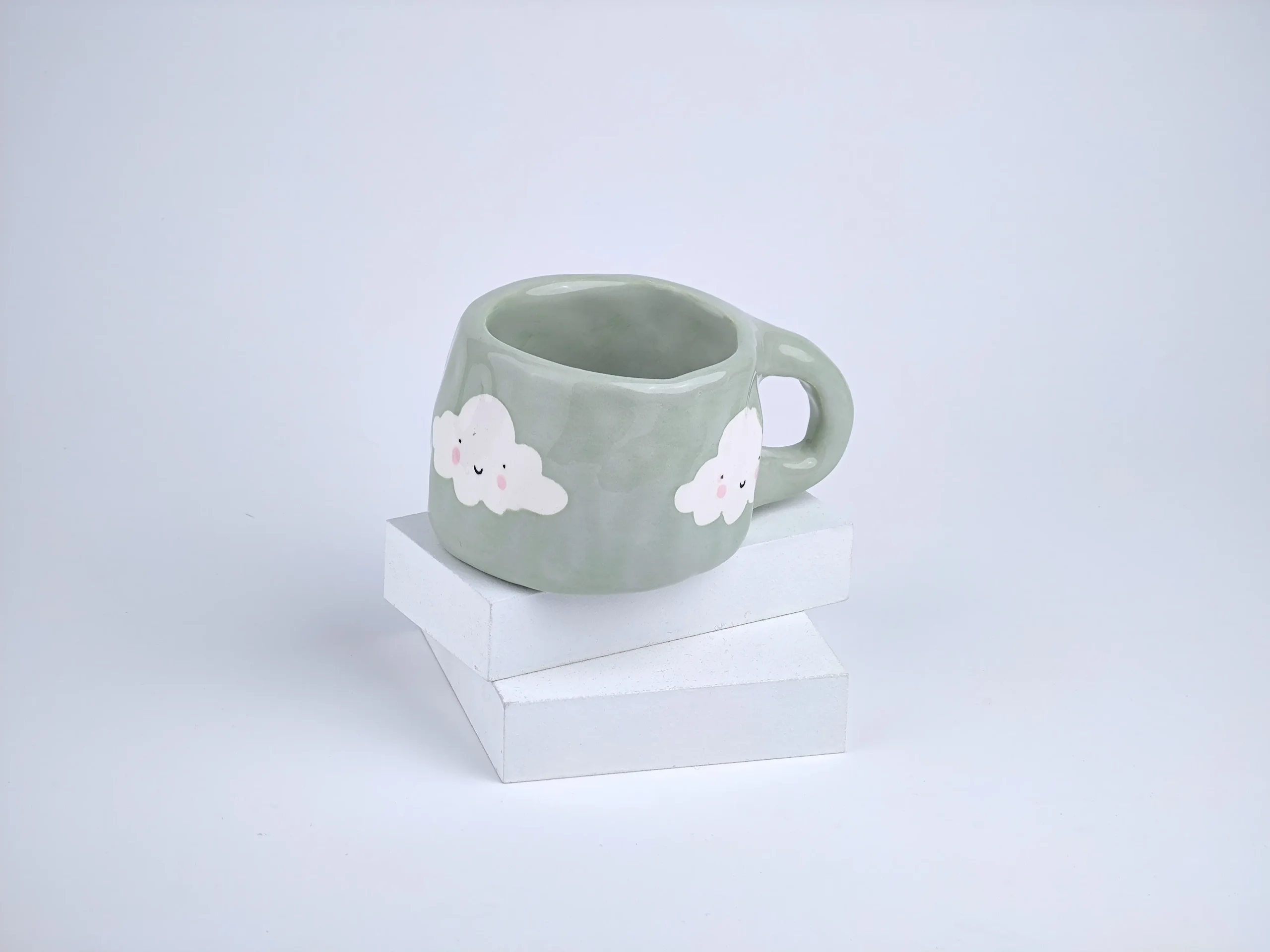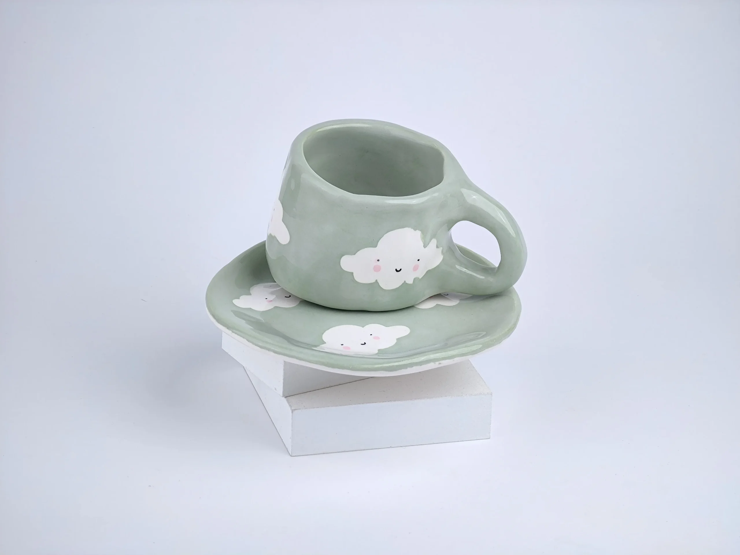 ماگ و زیرماگی ابر لبخنددار سبز | سرامیک دستساز فانتزی